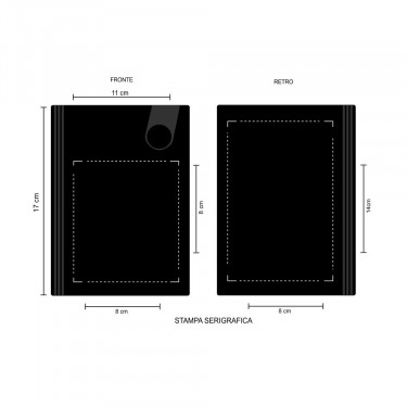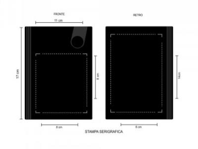 Aria di stampa max cm 8 x 8 oppure su lato più grande con stampa cm 8 x 14 con stampa in serigrafia monocolore. Grafica fornita dal cliente o richiedere bozza fornendo il logo in alta qualità o in vettoriale, inoltre indicare colore preferito articolo e colore di stampa.