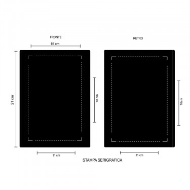 Aria di stampa max cm 11 x 18 oppure su lato più grande con stampa cm 11 x 18 con stampa in serigrafia monocolore. Grafica fornita dal cliente o richiedere bozza fornendo il logo in alta qualità o in vettoriale, inoltre indicare colore preferito articolo e colore di stampa.