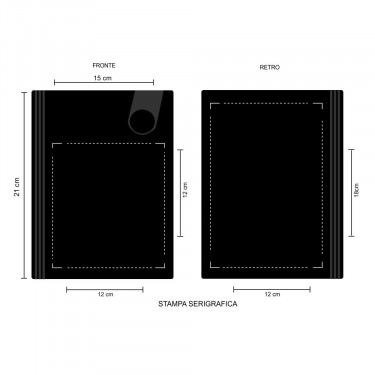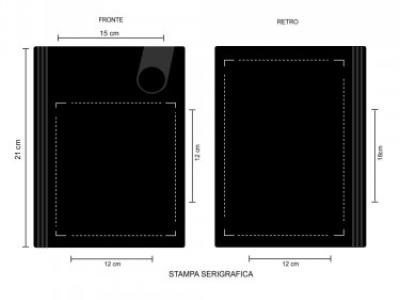 Aria di stampa max cm 11 x 11 oppure su lato più grande con stampa cm 11 x 18 con stampa in serigrafia monocolore. Grafica fornita dal cliente o richiedere bozza fornendo il logo in alta qualità o in vettoriale, inoltre indicare colore preferito articolo e colore di stampa.