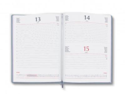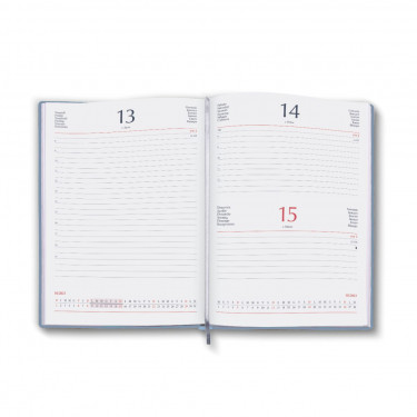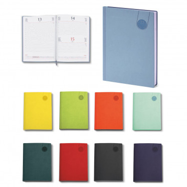 Agenda giornaliera “Tavecchi”. Materiale: printflex termovirante. Interno stampa 2 colori. Multi-lingue. Carta bianca. Sabato e domenica abbinati, rubrica telefonica, festività del mondo. Dimensioni cm.15x21.