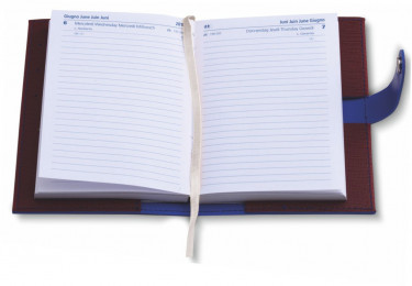 Agenda similpelle. Varie tasche p/card. Interno mobile giornaliero (9x13). Stampa 2 colori. Multilingue. Rubrica telefonica. Carta bianca.