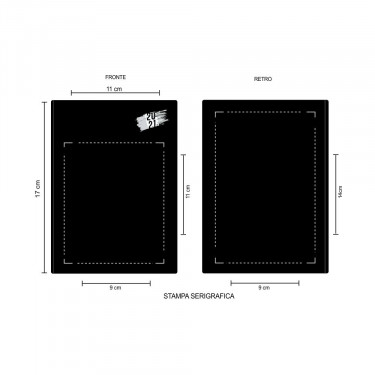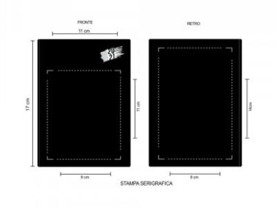 Aria di stampa max cm 9 x 11 oppure su lato più grande con stampa cm 9 x 14 con stampa in serigrafia monocolore. Grafica fornita dal cliente o richiedere bozza fornendo il logo in alta qualità o in vettoriale, inoltre indicare colore preferito articolo e colore di stampa.