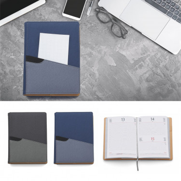 Agenda Giornaliera con inserto per penna e tasca esterna Interno estraibile. Termovirante. sabato e domenica abbinati, 320 pag. carta usomano bianca 60gr. Confezione in Astuccio. Dimensioni: cm 15x21.