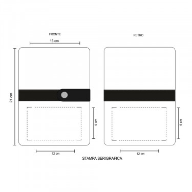 Aria di stampa max cm 12 x 6 oppure su lato più grande con stampa cm 12 x 6 con stampa in serigrafia monocolore. Grafica fornita dal cliente o richiedere bozza fornendo il logo in alta qualità o in vettoriale, inoltre indicare colore preferito articolo e colore di stampa.