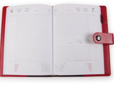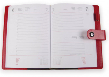 Agenda in similpelle. Vano porta penna. Chiusura c/linguetta a pressione. Interno mobile giornaliero (15x21). Stampa 2 colori. Sabato e domenica abbinati, rubrica telefonica, carta bianca. Multilingue.