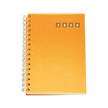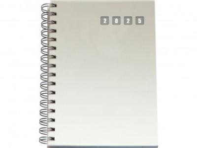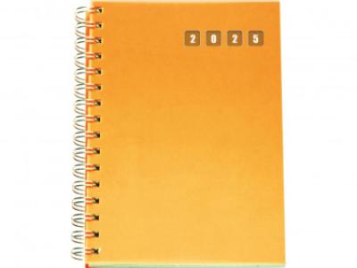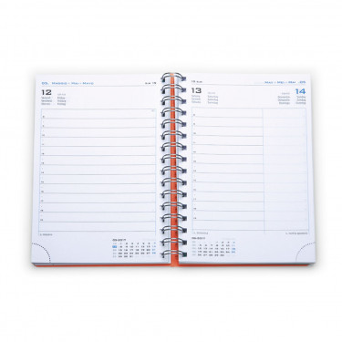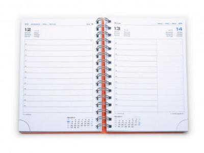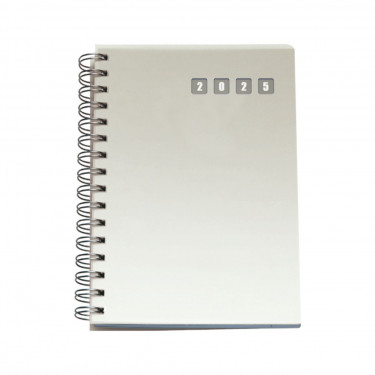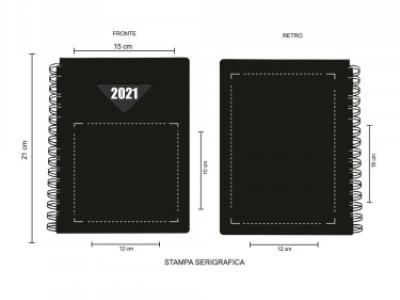 Agenda in polipropilene. Interno giornaliero con spirale stampato 2 colori. Carta bianca, angolo perforato. Rubrica telefonica stampata. Dimensioni cm 15x21.