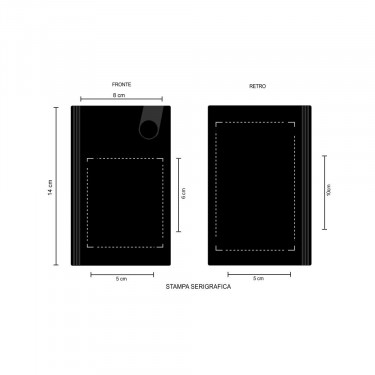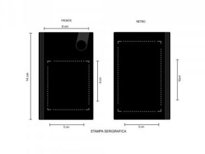 Aria di stampa max cm 5 x 6 oppure su lato più grande con stampa cm 5 x 10 con stampa in serigrafia monocolore. Grafica fornita dal cliente o richiedere bozza fornendo il logo in alta qualità o in vettoriale, inoltre indicare colore preferito articolo e colore di stampa.
