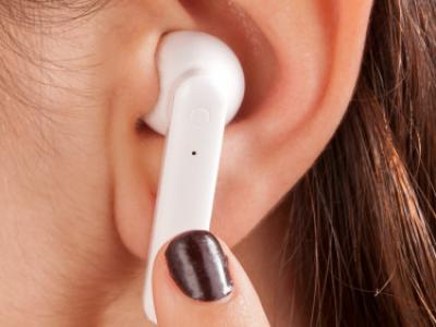Auricolari wireless Bluetooth 5.0 con custodia di ricarica. Elegante finitura in bianco lucido.