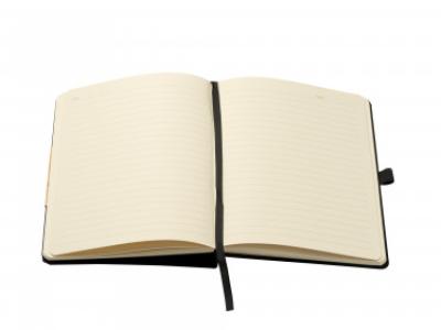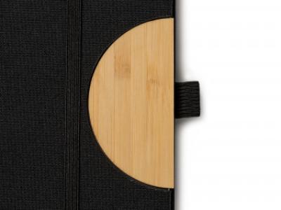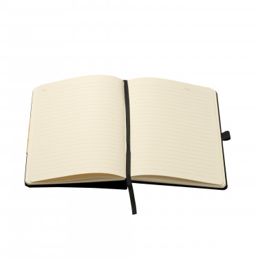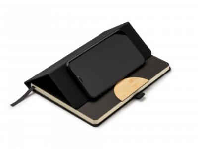 Block notes con copertina rigida in RPET, funzione di supporto cellulare, chiusura con elastico, inserto per penna, 80 fogli.