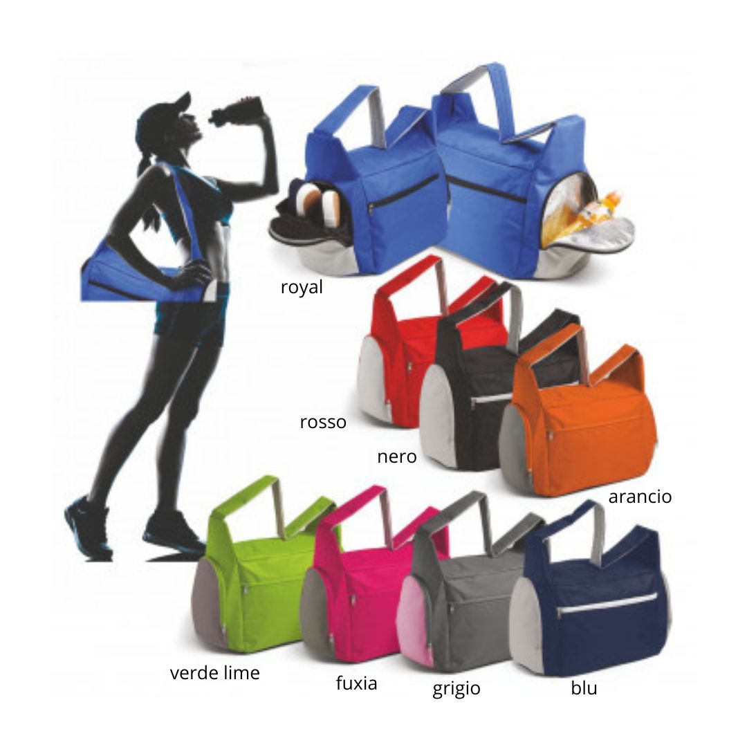 Borsa palestra in poliestere 600D. Tascone anteriore con zip. Doppie tasche laterali chiuse da zip: uso termico, uso porta scarpe. Manico a tracolla salva spalle. Interno plastificato. Aria di stampa max cm 22 x 7 con stampa in serigrafia monocolore. Grafica fornita dal cliente o richiedere bozza fornendo il logo in alta qualità o in vettoriale, inoltre indicare colore preferito e colore di stampa.