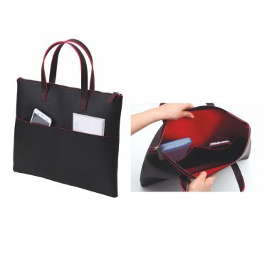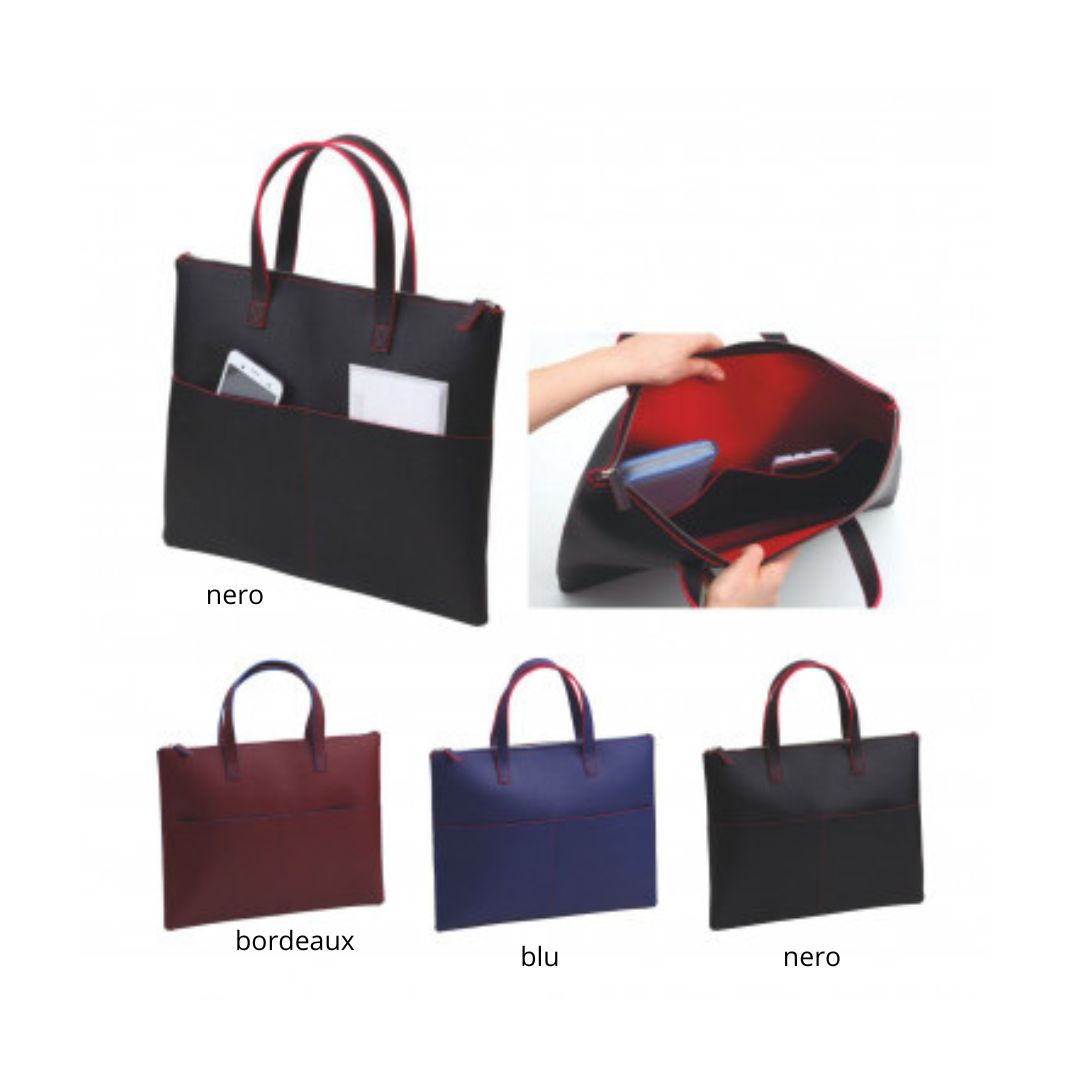 Borsa porta documenti in similpelle. 2 tasche interne. 2 tasche esterne. Doppio manico (cm. 2x50). Profili e interno a contrasto. Chiusura con zip.