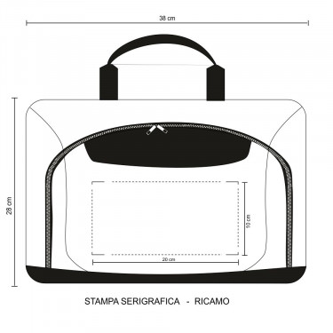 Borsa professionale poliestere 600D. Tasca frontale doppio cursore con vano p/penna e p/cellulare. Tracolla regolabile e removibile. Doppio manico. Confezione in polybag. Aria di stampa max cm 20 x 10 con stampa in serigrafia monocolore. Grafica fornita dal cliente o richiedere bozza fornendo il logo in alta qualità o in vettoriale, inoltre indicare colore preferito e colore di stampa.