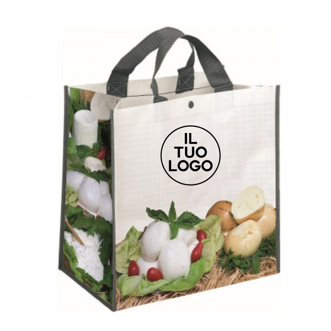 Borsa shopping PP “formaggio”. Doppio manico. Chiusura con bottoncino, aria di stampa max cm 27 x 12 con stampa in serigrafia monocolore. Se si desidera la stampa su ambo i lati richiedere se e possibile su questo articolo e costi aggiuntivi.