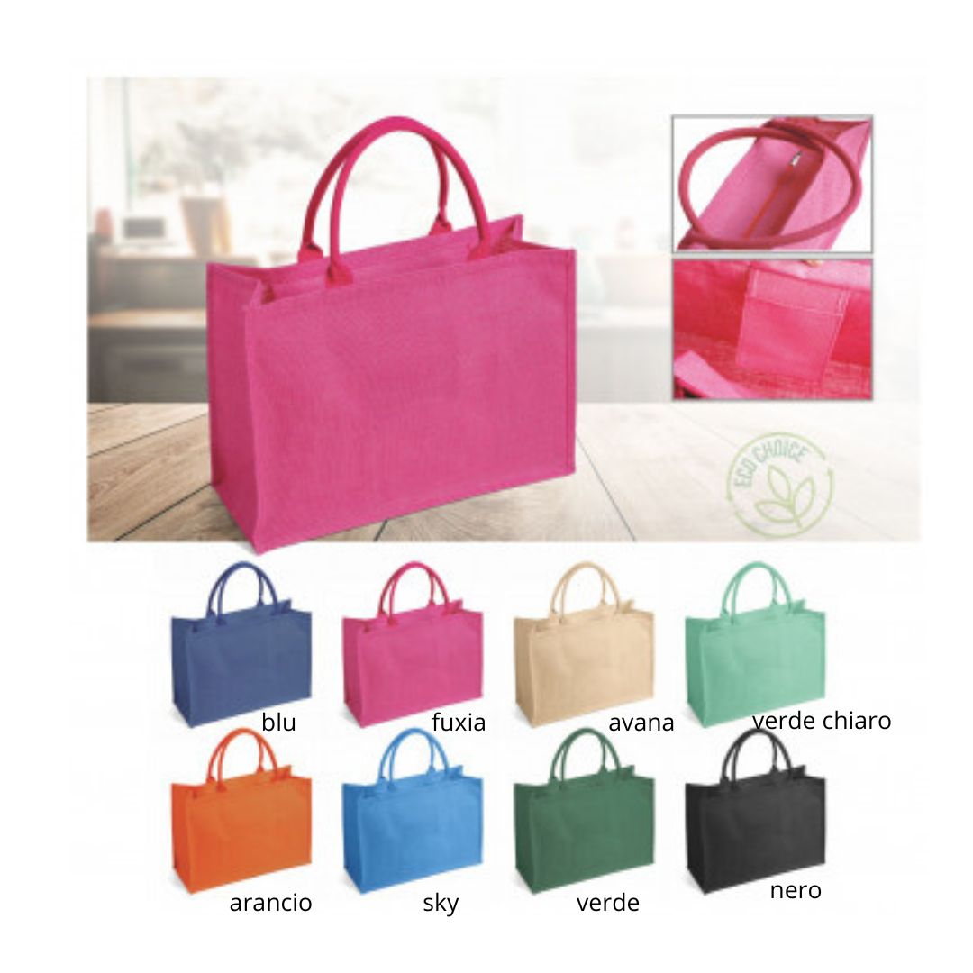 Borsa in juta tinta laminata con manici in corda da 50cm, chiusura zip e taschino interno, aria di stampa max cm 27 x 12 con stampa in serigrafia monocolore. Se si desidera la stampa su ambo i lati richiedere se e possibile su questo articolo e costi aggiuntivi. Grafica fornita dal cliente o richiedere bozza fornendo il logo in alta qualità o in vettoriale, inoltre indicare colore preferito e colore di stampa. Dimensione shopper cm 48 x 34 x 19 colori:blu, fuxia, avana, verde chiaro, arancio, sky, verde, nero. Il prezzo indicato e per un pezzo compreso stampa, con un minimo di ordine di 1 collo da 100 pezzi, per ordine multipli viene applicato uno sconto.