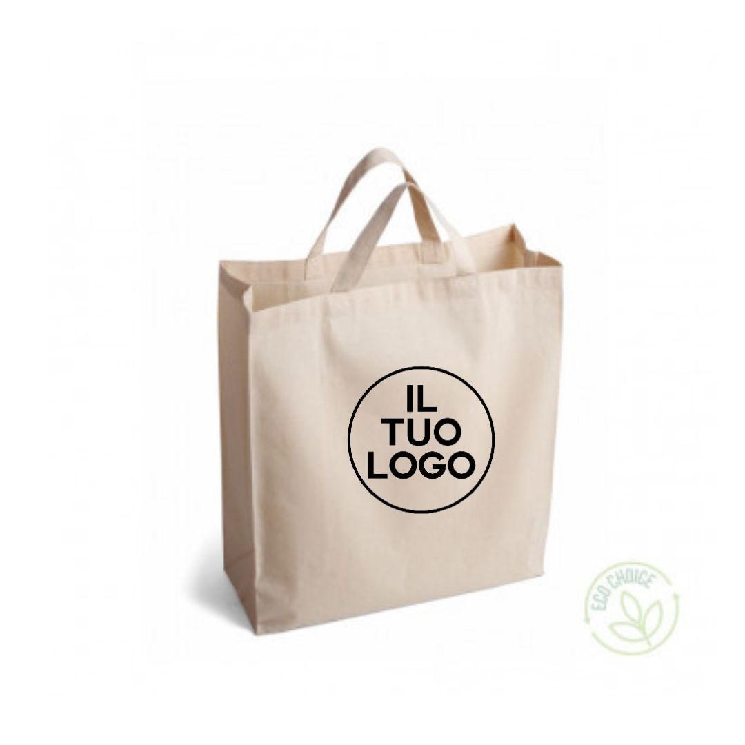 Borsa shopping in cotone riciclato 180gr con manici lunghi cm 2,5x60, aria di stampa max cm 25 x 20 con stampa in serigrafia monocolore. Se si desidera la stampa su ambo i lati richiedere se e possibile su questo articolo e costi aggiuntivi.