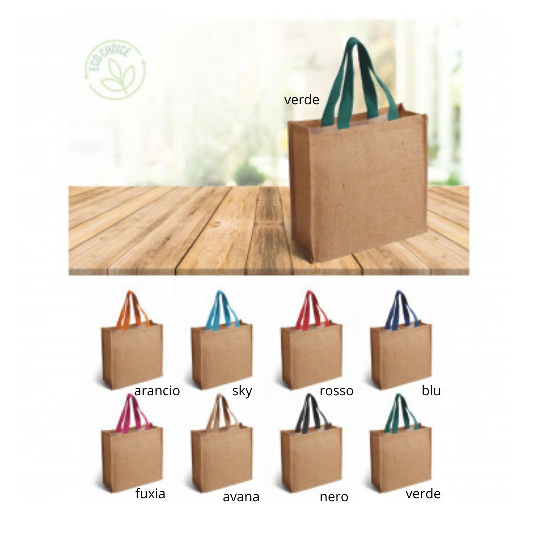 Borsa Shopping in juta laminata. Manici rinforzati in corda cm 56, aria di stampa max cm 25 x 22 con stampa in serigrafia monocolore. Se si desidera la stampa su ambo i lati richiedere se e possibile su questo articolo e costi aggiuntivi.