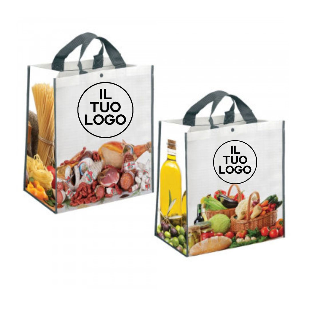 Borsa shopping PP con soggetti vari. Doppio manico. Chiusura con bottoncino, aria di stampa max cm 28.5 x 14 con stampa in serigrafia monocolore. Se si desidera la stampa su ambo i lati richiedere se e possibile su questo articolo e costi aggiuntivi.