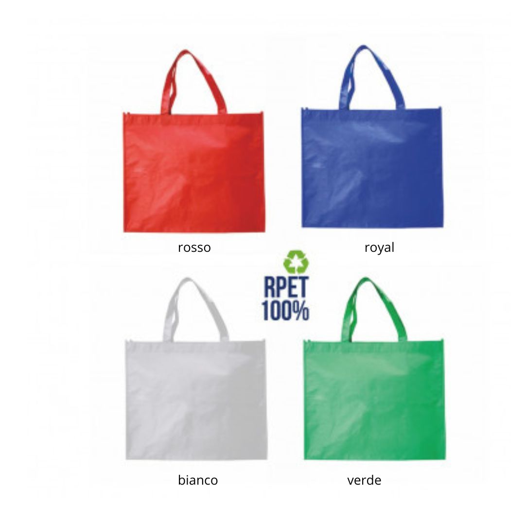 Borsa shopping in RPET, cucita con rifinitura in laminato opaco, manici rinforzati, aria di stampa max cm 25 x 22 con stampa in serigrafia monocolore. Se si desidera la stampa su ambo i lati richiedere se e possibile su questo articolo e costi aggiuntivi.