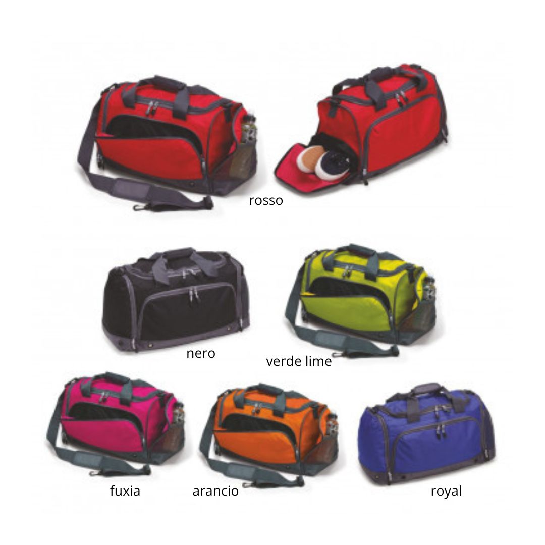 Borsone palestra in poliestere 600D. Chiuso con zip doppio cursore. Doppio manico con im-pugnatura imbottita chiuso da velcro. Tasca anteriore con zip, doppio cursore. Tasche entrambi i lati con zip. Tasca laterale elasticizzata. Completo di tracolla removibile, regolabile, salva spal-le. Piedini antiscivolo in plastica. aria di stampa max cm 20 x 10 con stampa in serigrafia monocolore. Grafica fornita dal cliente o richiedere bozza fornendo il logo in alta qualità o in vettoriale, inoltre indicare colore preferito e colore di stampa.
