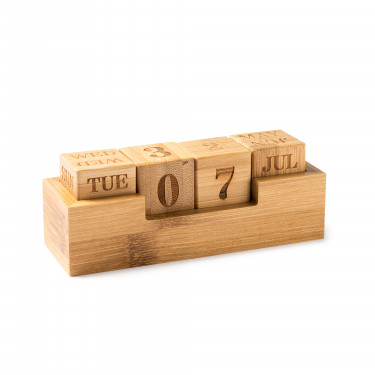 Calendario perpetuo da tavolo in bamboo. Formato da supporto e quattro blocchi incisi. Dimensioni: cm 13,6x4,6x4,9 Confezione in Astuccio. Aria di stampa max cm 8x4 con stampa in serigrafia monocolore. Grafica fornita dal cliente o richiedere bozza fornendo il logo in alta qualità o in vettoriale, inoltre indicare colore preferito e colore di stampa. il prezzo indicato e per un pezzo compreso stampa con un minimo di ordine di 1 cartone contenente 20 pezzi, per ordine multipli viene applicato uno sconto.