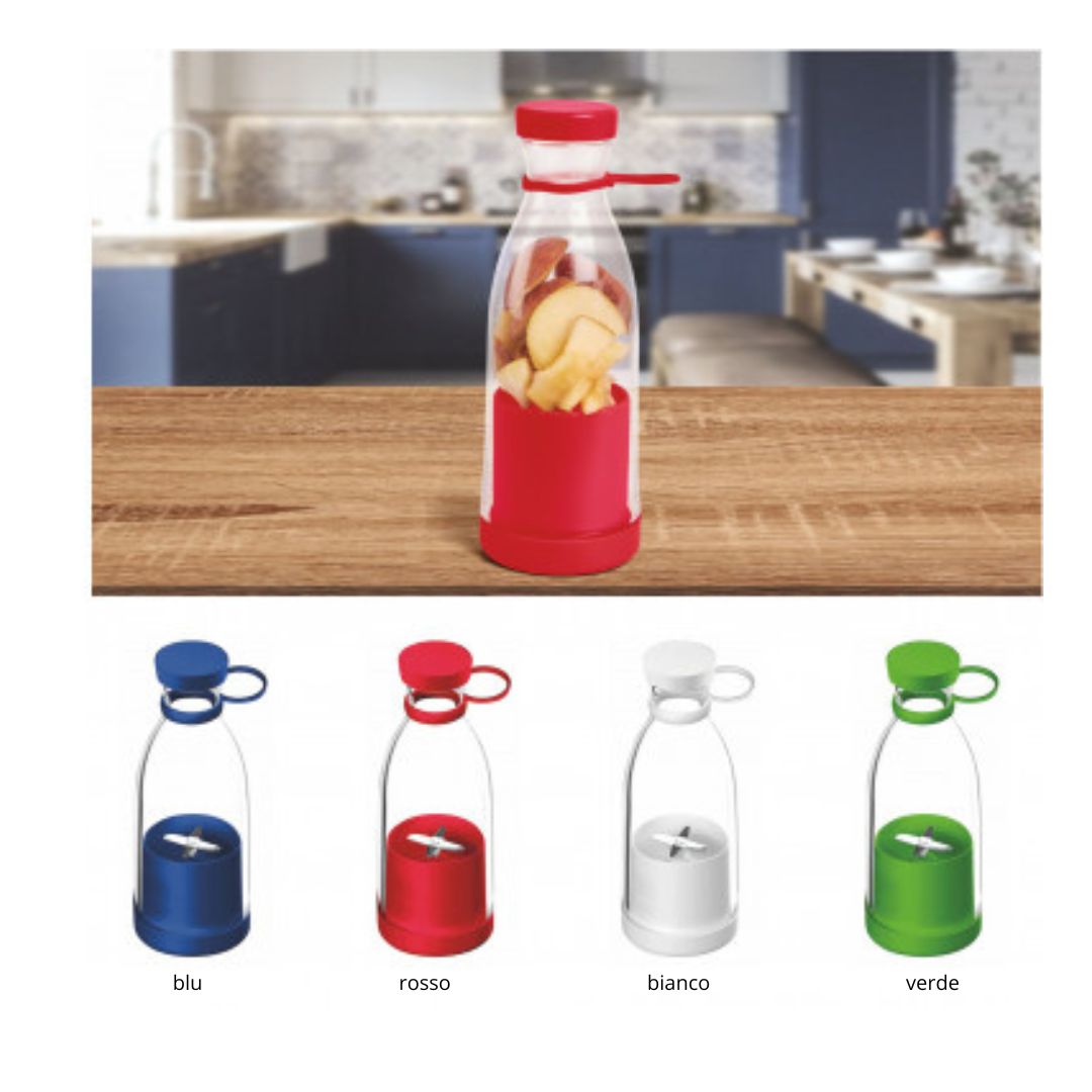 Mini frullatore portatile USB da viaggio, capacità 380ml, con maniglia per il trasporto. In PET e PP. Confezione in astuccio. Dimensioni: cm 7,4 H 21,2. Stampa in tre modalità che sono tampografia , incisione laser e stampa UV in tutti i tre i casi stampa monocolore (stampa multicolor richiedere info e preventivo). Grafica fornita dal cliente o richiedere bozza fornendo il logo in alta qualità o in vettoriale, inoltre indicare colore preferito e colore di stampa. Colori: vedi foto colori disponibili Il prezzo indicato e per un pezzo compreso stampa in tampografia/serigrafia, con un minimo di ordine 48 pezzi , per ordine multipli viene applicato uno sconto