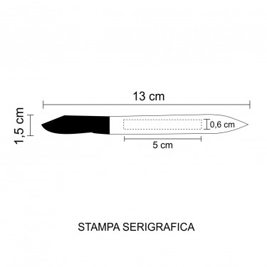 Aria di stampa max cm 5 x 0.6 con stampa in serigrafia/tampografia monocolore. Grafica fornita dal cliente o richiedere bozza fornendo il logo in alta qualità o in vettoriale, inoltre indicare colore preferito e colore di stampa.