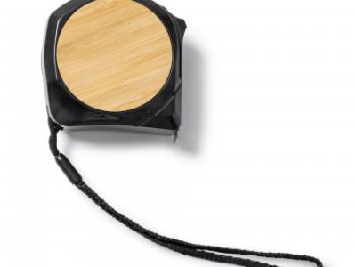 Flessometro da 5 m con meccanismo di bloccaggio e gancio a nastro metallico. Clip in metallo, tracolla e dettagli in bamboo.