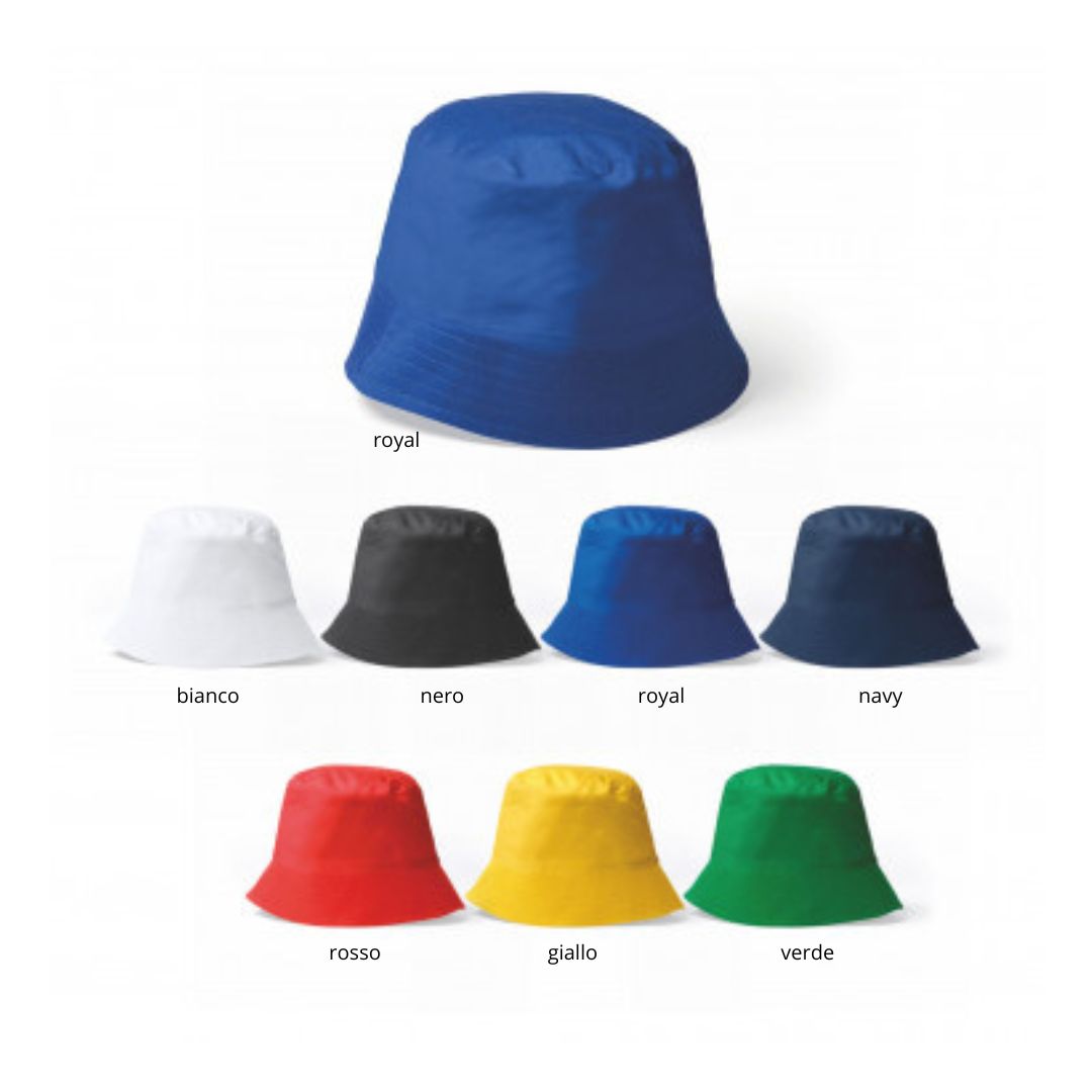 Cappello in stile bob tinta unita. In cotone 100%. Diametro 60cm. Taglia unica. colori: bianco, nero, royal, navy, rosso, giallo, verde. Aria di stampa max CM 7 X 4 cm in serigrafia monocolore (per stampa multicolor richiedere info). Grafica fornita dal cliente o richiedere bozza fornendo il logo in alta qualità o in vettoriale, inoltre indicare colore preferito e colore di stampa. Il prezzo indicato e per un pezzo compreso stampa in serigrafia, con un minimo di ordine 50 pezzi, per ordine multipli viene applicato uno sconto.