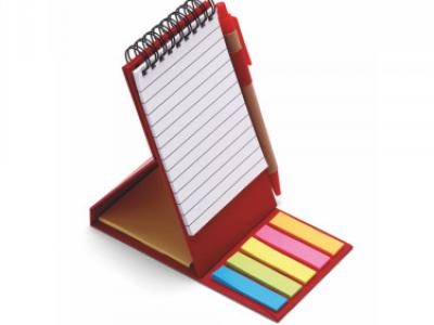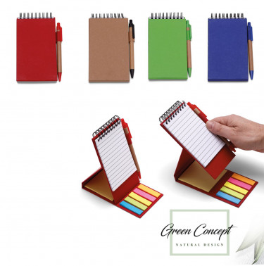 Blocco notes “Eco paper”. Carta 70gr. 70 fogli a righe. Corredato di: 25 post-it per colore, penna refill nero.