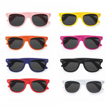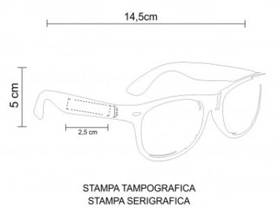Occhiali da sole dal design classico con finitura lucida. Protezione UV400. colore: rosa, arancio, bianco, blu, fuxia, giallo, nero, rosso, verde. Aria di stampa max cm 2.5 x 0.8 con stampa in serigrafia monocolore. Grafica fornita dal cliente o richiedere bozza fornendo il logo in alta qualità o in vettoriale, inoltre indicare colore preferito e colore di stampa. il prezzo indicato e per un pezzo compreso stampa con un minimo di ordine di 1 cartone contenente 100 pezzi, per ordine multipli viene applicato uno sconto.