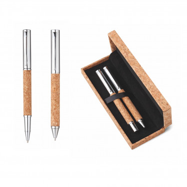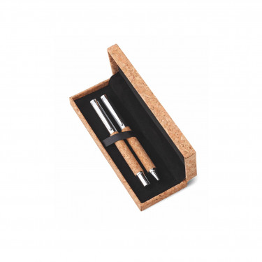 Parure composto da penna a sfera refil nero e penna gel in sughero e metallo. Confezione in astuccio di sughero.