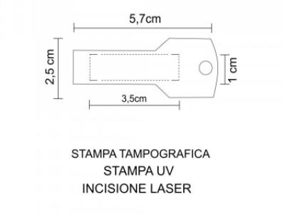 Aria di stampa cm 3.5 x 1 con stampa in serigrafia/tampografia monocolore. Grafica fornita dal cliente o richiedere bozza fornendo il logo in alta qualità o in vettoriale, inoltre indicare colore preferito e colore di stampa. Per incisioni LASER ED UV richiedere preventivo.