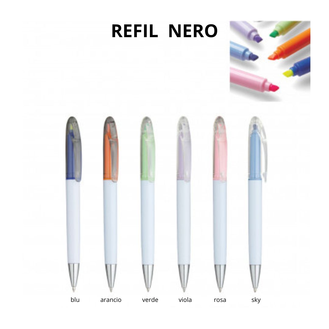 Penna a Sfera con evidenziatore. In palstica con clip in metallo. Refill nero.