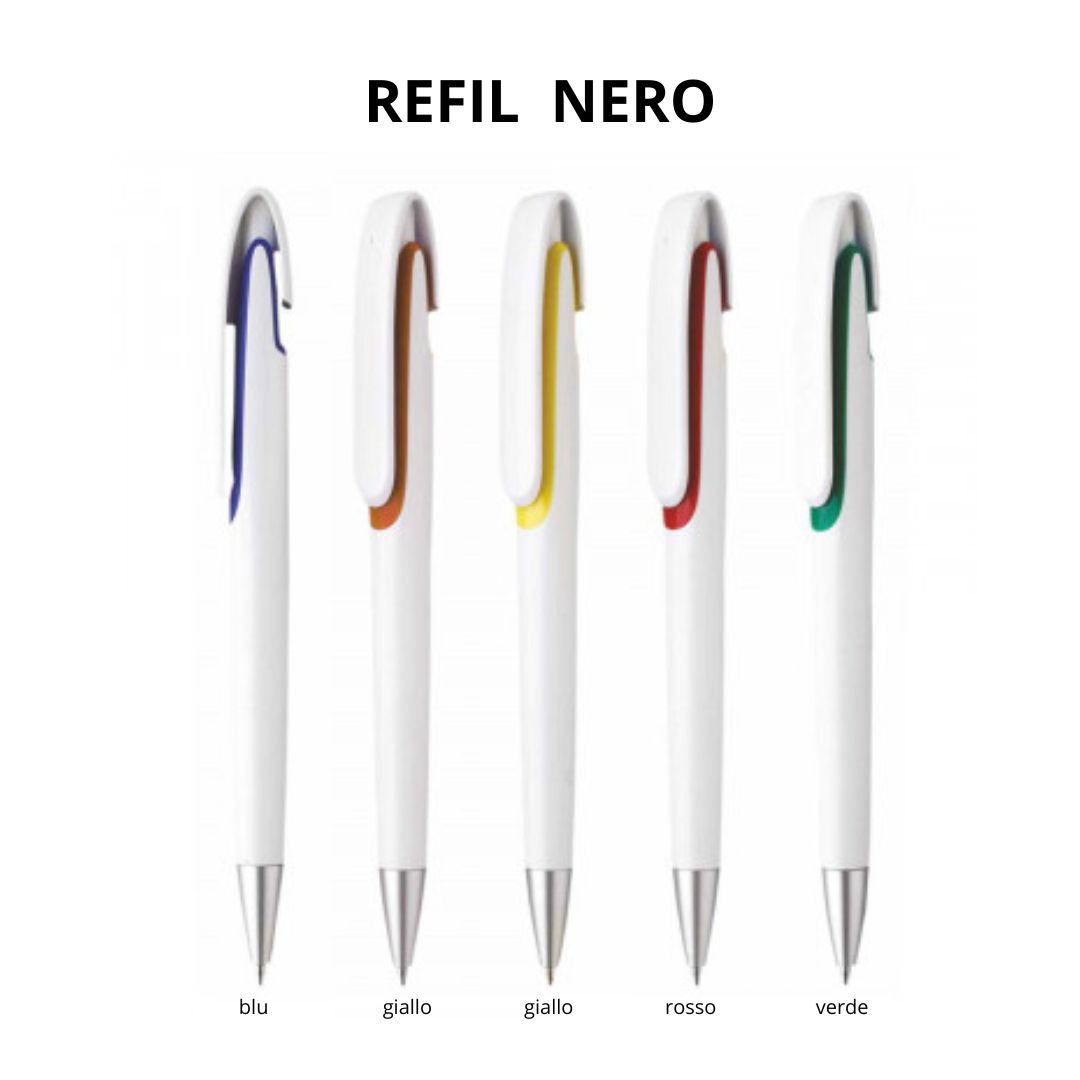 Penna sfera a scatto in plastica con clip in plastica. Fusto bianco particolari colorati. Refill nero.