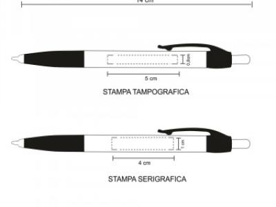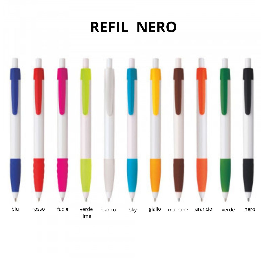 Penna sfera a scatto in plastica. Fusto bianco particolari colorati. Refill nero.