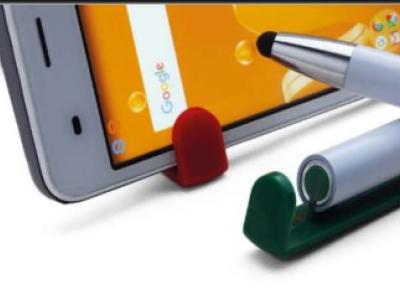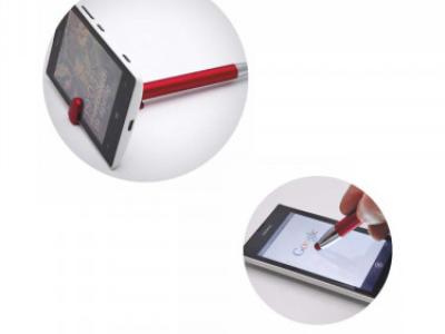 Penna sfera a scatto touch in plastica. Clip funzionalità supporto cellulare. Fusto colorato. Refill nero.