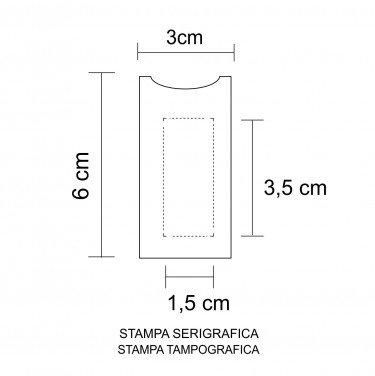 Aria di stampa max cm 1.5 x 3.5 con stampa in serigrafia/tampografia monocolore. Grafica fornita dal cliente o richiedere bozza fornendo il logo in alta qualità o in vettoriale, inoltre indicare colore preferito e colore di stampa.