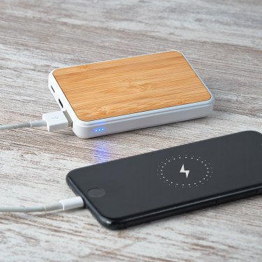 Batteria esterna da 5.000 mAh, ABS bianco e superficie in bamboo.