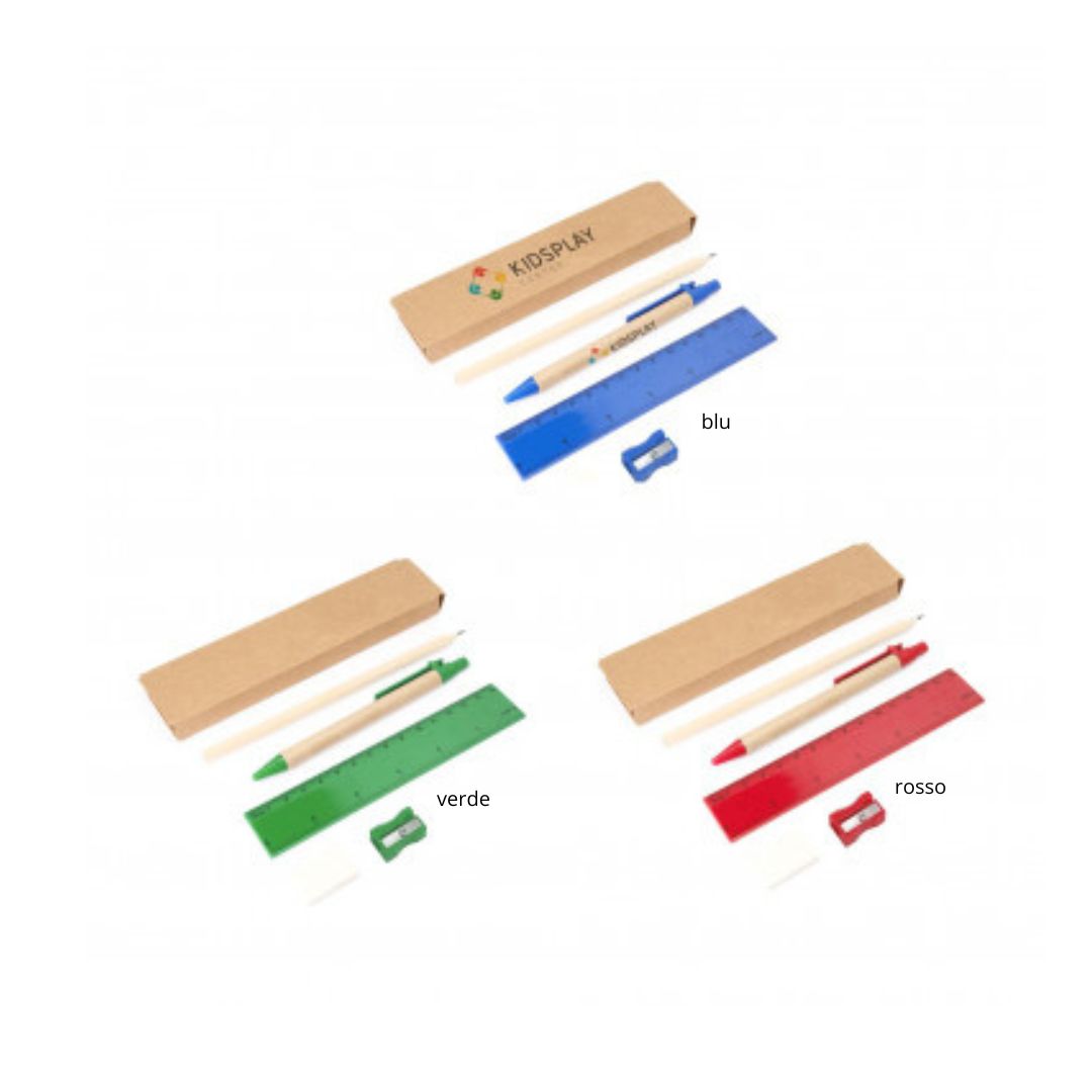 Set Scrittura 5pz Scatola cartone kraft. Include penna con corpo in cartone e refill nero, matita in legno, temperamatite,gomma e righello da 15 cm.