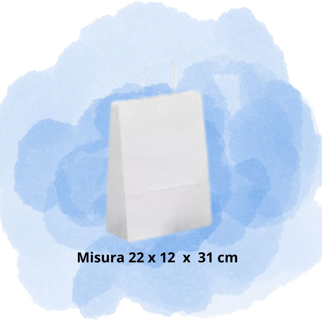 Shopper di carta Kraft misura 22x12x31 con maniche a tortiglioni o piatta di colore bianca, collo da 200 pezzi. La stampa monocolore e su ambo i lati con grafica fornita dal cliente, in caso che bisogna realizzare la grafica e da concordare, i tempi di consegna dopo approvazione grafica vi verrà comunicata. Il prezzo indicato e la quantità e misura riportata, per altri colori dello shopper richiedere se ci sono disponibilità e indicare il colore di stampa.