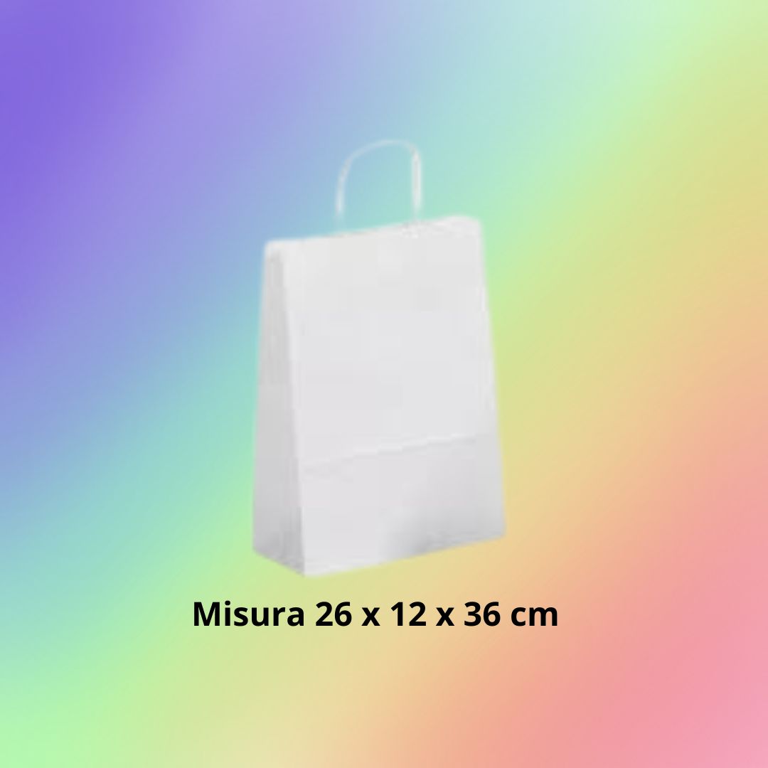 Shopper di carta Kraft misura 26x12x36 con maniche a tortiglioni o piatta di colore bianca, collo da 200 pezzi. La stampa monocolore e su ambo i lati con grafica fornita dal cliente, in caso che bisogna realizzare la grafica e da concordare, i tempi di consegna dopo approvazione grafica vi verrà comunicata. Il prezzo indicato e la quantità e misura riportata, per altri colori dello shopper richiedere se ci sono disponibilità e indicare il colore di stampa.