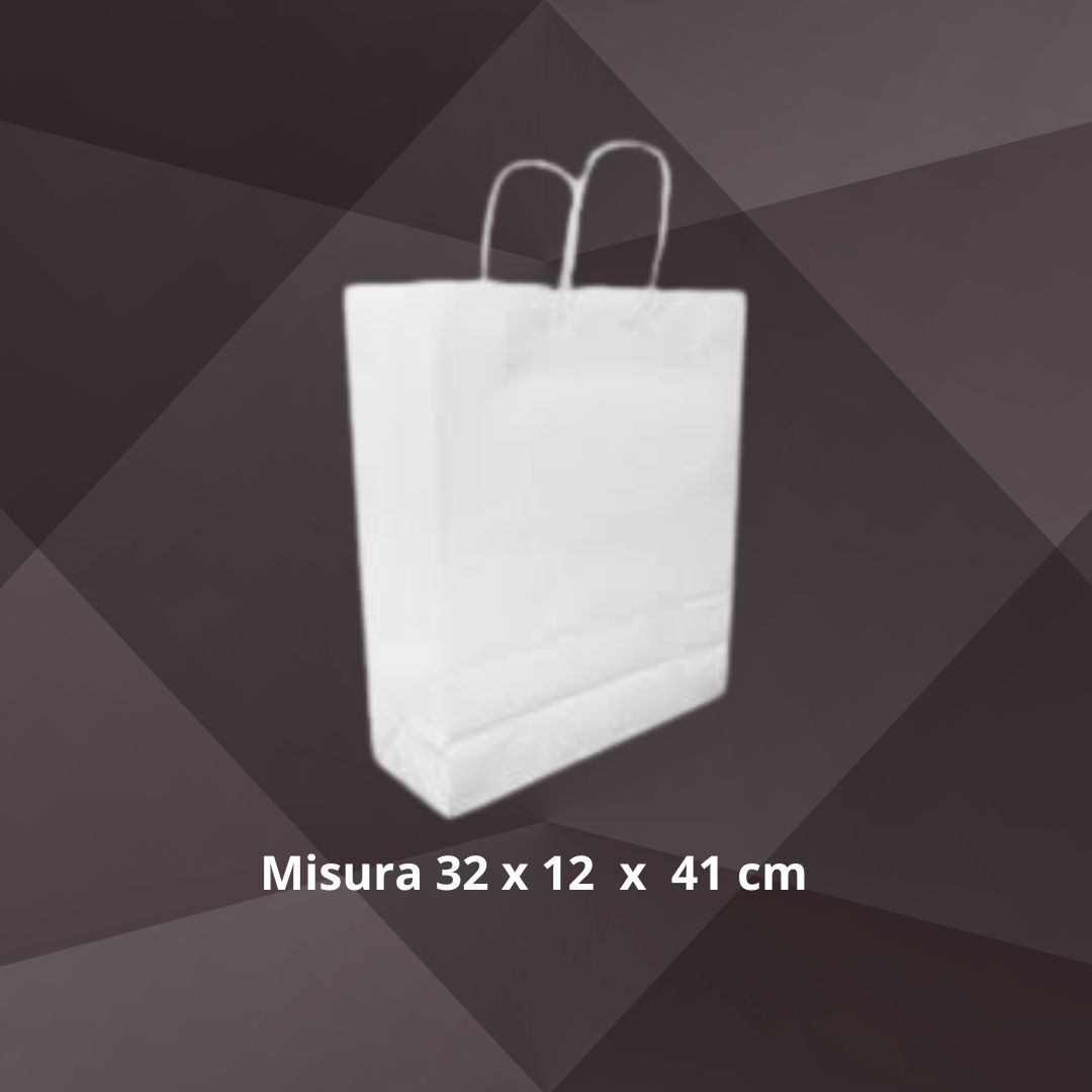 Shopper di carta Kraft misura 32x12x41 con maniche a tortiglioni o piatta di colore bianca, collo da 200 pezzi. La stampa monocolore e su ambo i lati con grafica fornita dal cliente, in caso che bisogna realizzare la grafica e da concordare, i tempi di consegna dopo approvazione grafica vi verrà comunicata. Il prezzo indicato e la quantità e misura riportata, per altri colori dello shopper richiedere se ci sono disponibilità e indicare il colore di stampa.