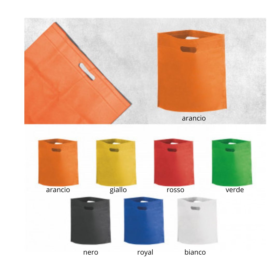 Shopper in TNT da 80 g/m² con robusti manici fustellati e finitura termosaldata con stampa in serigrafia monocolore. Se si desidera la stampa su ambo i lati richiedere se e possibile su questo articolo e costi aggiuntivi.