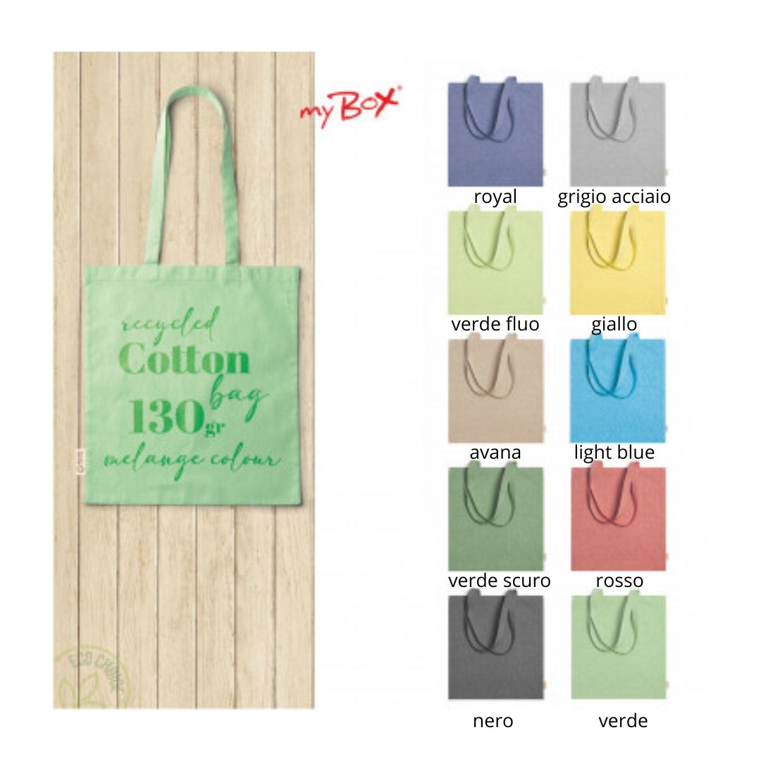 Shopper in 100% cotone riciclato da 120 g/m² con finitura marmorizzata con manici lunghi 70 cm, aria di stampa max cm 27 x 21 con stampa in serigrafia monocolore. Se si desidera la stampa su ambo i lati richiedere se e possibile su questo articolo e costi aggiuntivi.