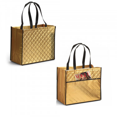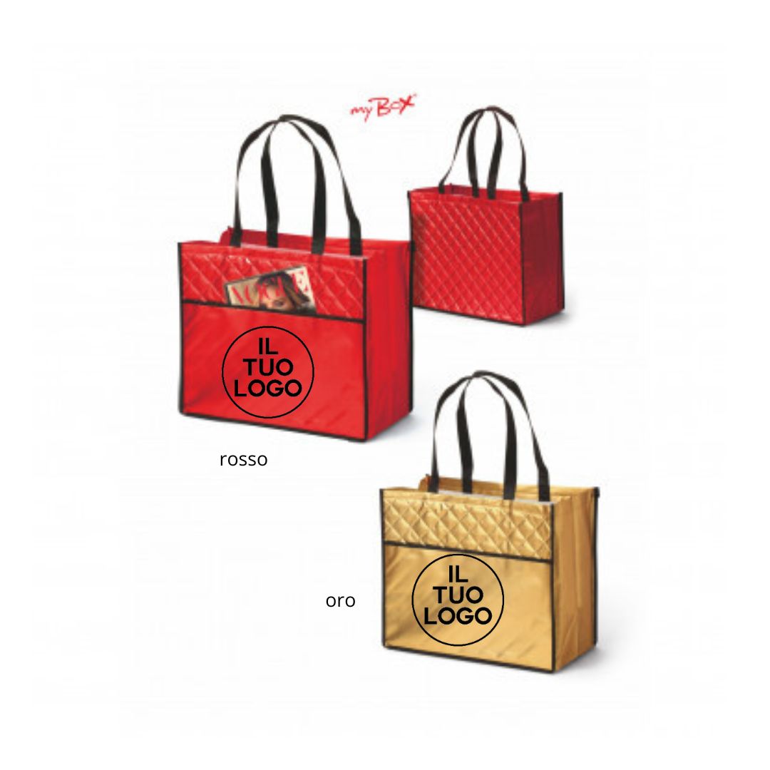 Borsa shopping deluxe in tnt laminato. Cucita. Ampia tasca anteriore. Manici tracolla (cm.2,5x54), aria di stampa max cm 27 x 16 con stampa in serigrafia monocolore. Se si desidera la stampa su ambo i lati richiedere se e possibile su questo articolo e costi aggiuntivi. Grafica fornita dal cliente o richiedere bozza fornendo il logo in alta qualità o in vettoriale, inoltre indicare colore preferito e colore di stampa. Dimensione shopper cm 38 x 32.5 x 20 colori: rosso, oro, silver Il prezzo indicato e per un pezzo compreso stampa, con un minimo di ordine di 1 minicollo da 50 pezzi, per ordine multipli viene applicato uno sconto.