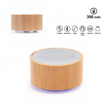 Speaker Wireless. Bamboo e Abs. Batteria ricaricabile. Con durata circa 3 ore.