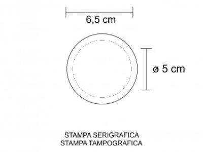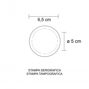 Aria di stampa max Ǿ 5 cm con stampa in serigrafia/tampografia monocolore. Grafica fornita dal cliente o richiedere bozza fornendo il logo in alta qualità o in vettoriale, inoltre indicare colore preferito e colore di stampa.
