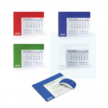 Tappetino rettangolare per mouse con calendario. Copertina in un unico colore e trasparente, per poter vedere il foglio del mese corrispondente. La copertina è sollevata per accedere al calendario di 12 pagine in spagnolo e inglese, le cui pagine sono ma strappo. Su ogni foglio appaiono il mese in corso, il mese precedente e il mese successivo. Base antiscivolo nera. Grammatura carta 80 g/m². Spessore della copertina 0,3cm. Dimensioni: 23cm x 18cm.