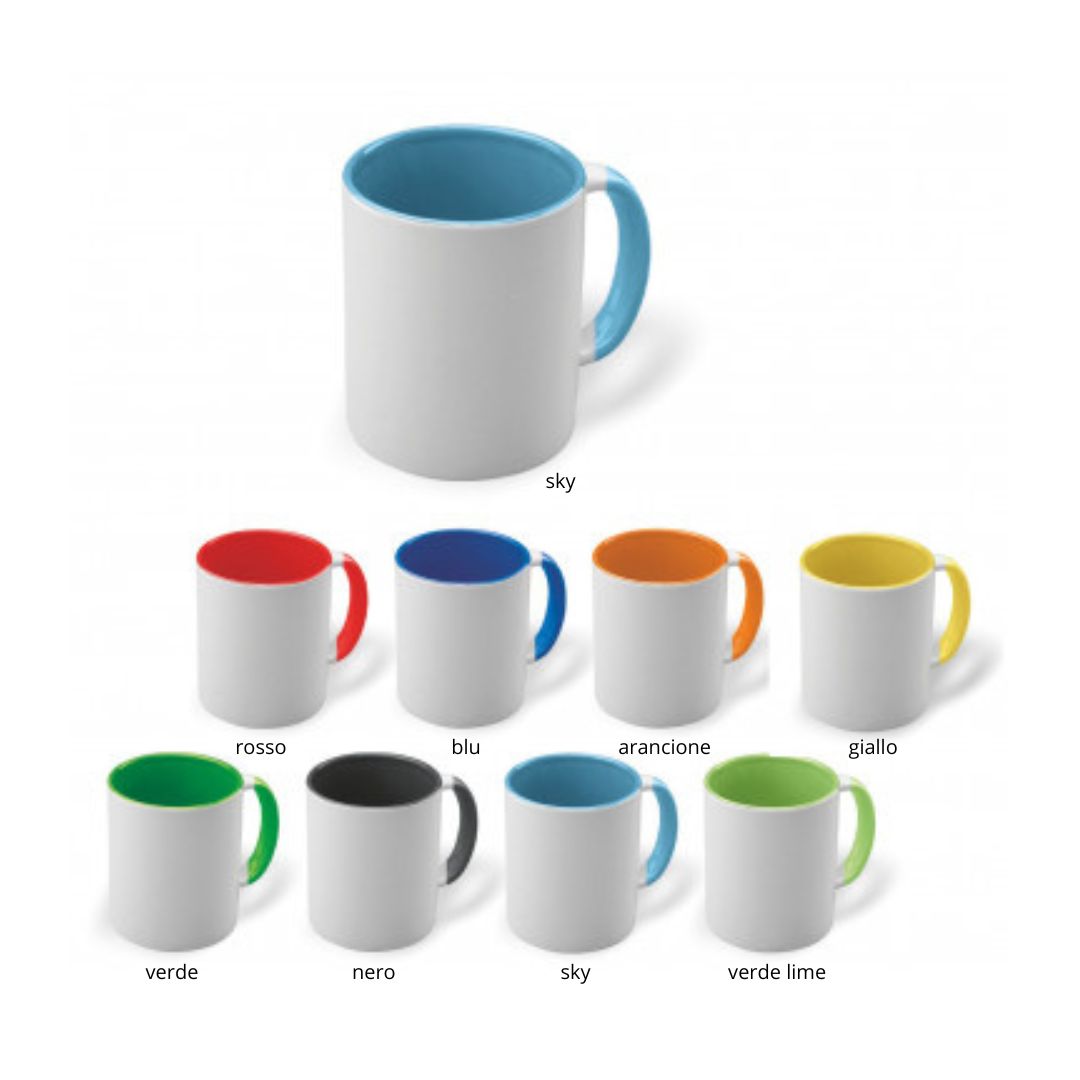 Tazza “Mugs” in ceramica, con interno colorato. Capacità 320ml / 11oz Adatta a stampa sublimatica a 360° gradi. Dimensioni Ǿ cm.8 h cm 9,8. Area di stampa a tampografia/serigrafia e molto piccolo per il tipo di forma dell'oggetto oltre ad essere monocolore. Si consiglia la stampa a sublimazione che ha un'area di stampa di cm 18x8 ed è multicolor. Grafica fornita dal cliente o richiedere bozza fornendo il logo in alta qualità o in vettoriale, inoltre indicare colore preferito dell'oggetto se sono presenti piu colori e colore di stampa, per la sublimazione richiedere preventivo. Colori disponibili quelli presenti in foto. Il prezzo indicato e con stampa in serigrafia/tampografia monocolore con un minimo di acquisto di 36 pezzi.