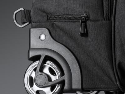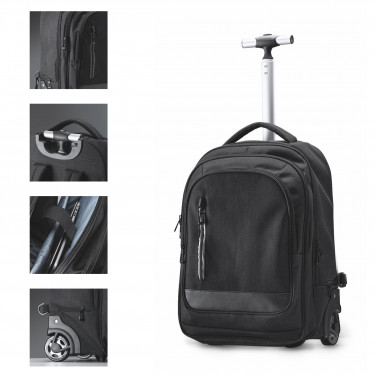 Zaino trolley in poliestere mélange 300D. Tasca principale con scomparto imbottito porta computer fino a 15’’. Due tasche con scomparti interne e una tasca frontale. Spalline imbottiti regolabili.